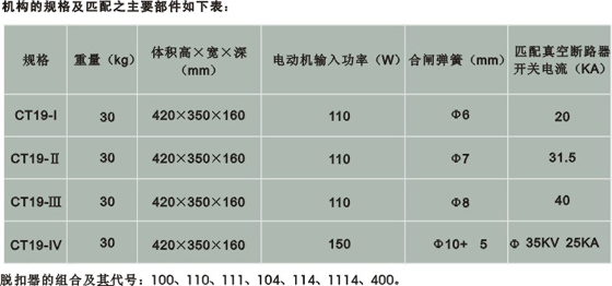 CT19 型弹簧操动机构可供操动各类固定式开关柜中ZN28型系列高压真空断路器及其合闸功与之相当的其他类型的真空断路器之用,其性能符合GB1984《交流高压断路器》和本产品《技术条件》的要求,各项指标均达到和超过“IEC”标准。机构合闸弹簧的储能方式有电动机储能和手动储能两种;分闸操作有分闸电磁铁 、过电流脱扣电磁铁及手动按钮操作三种 ;合闸操作有合闸电磁铁及手动按钮操作两种。