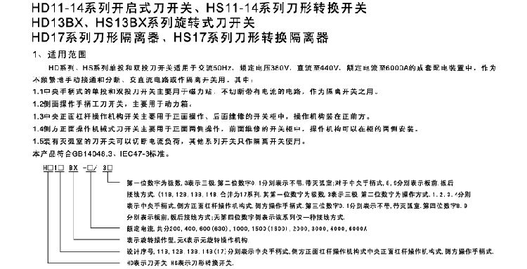 HD11、HD12、HD13、HD14、HD11B、HD13B、HD14B、HS11、HS12、HS13、HS11B、HS13B系列刀形转换开关